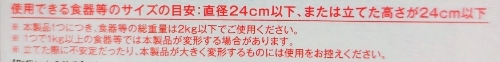 使用できる食器は、直径24cm以下、または立てた高さが24cm以下のお皿です。